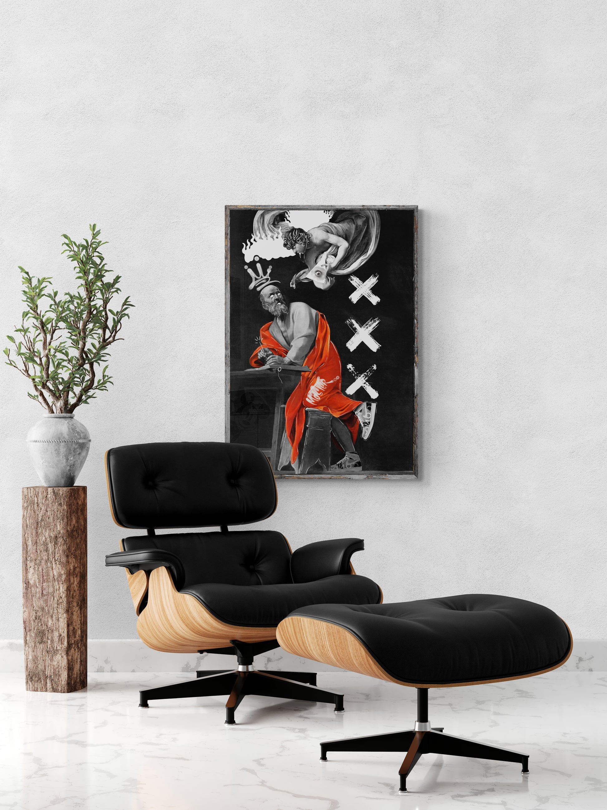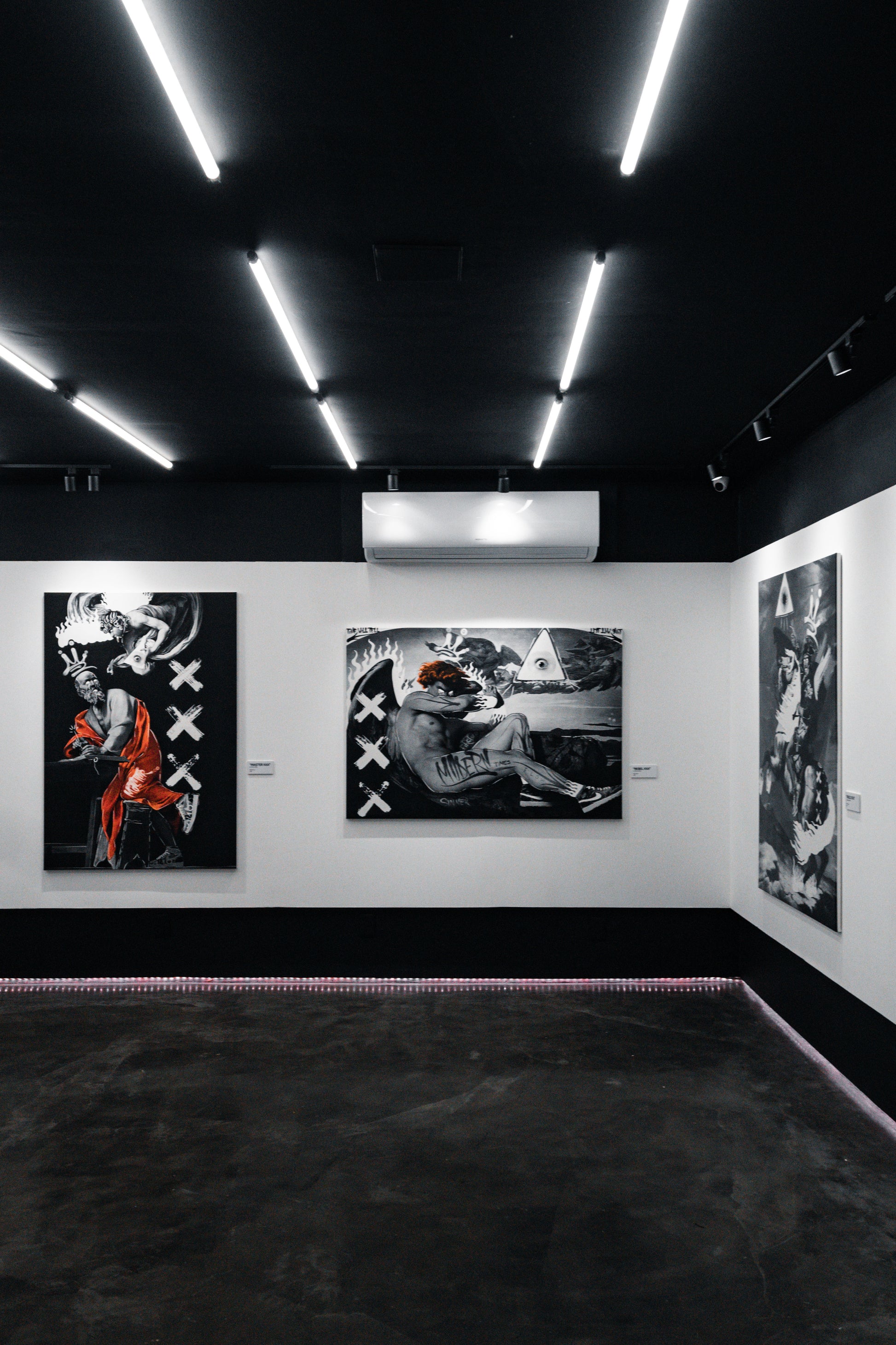 Timeless figures meet street edge, creating a raw, layered tension between elegance and disruption. XXX brings together the quiet drama of antique paintings with unexpected, playful twists. Monochromatic tones set the stage for sharp sticker-like graffiti marks and bold hits of color.