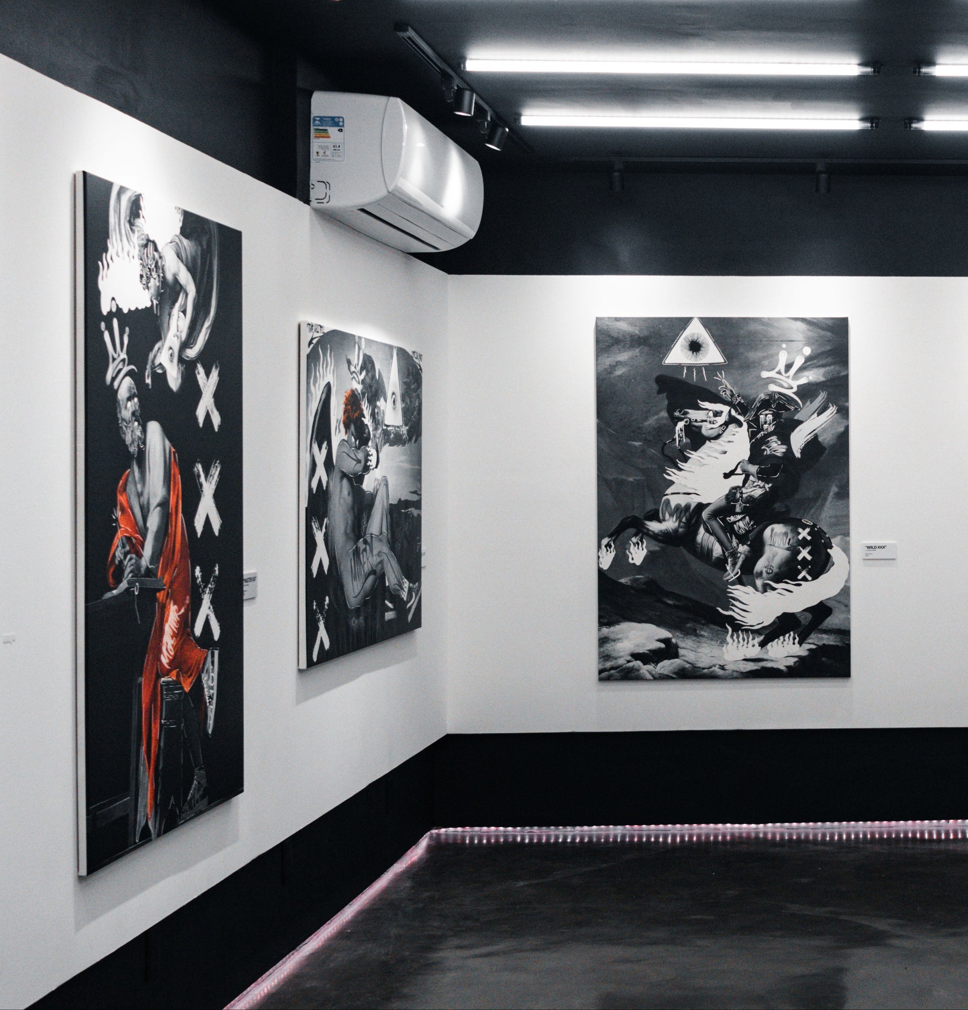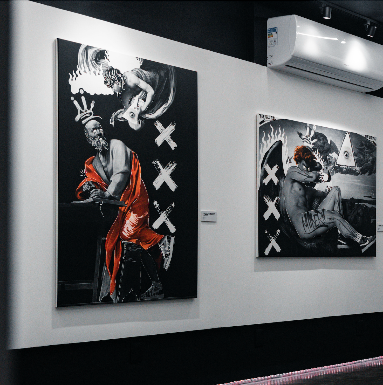 Timeless figures meet street edge, creating a raw, layered tension between elegance and disruption. XXX brings together the quiet drama of antique paintings with unexpected, playful twists. Monochromatic tones set the stage for sharp sticker-like graffiti marks and bold hits of color.